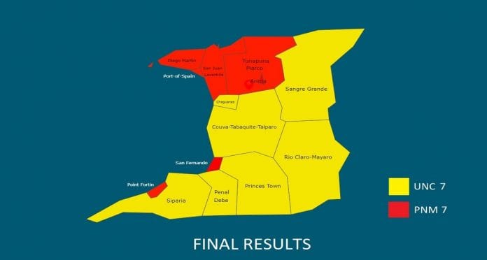 PORT OF SPAIN, Trinidad – The ruling People’s National Movement (PNM) and the main opposition United National Congress (UNC) each won seven of the 14 electoral districts in Trinidad in Monday’s Local Government elections (LGE) with both parties indicating that the electorate had sent differing messages.
