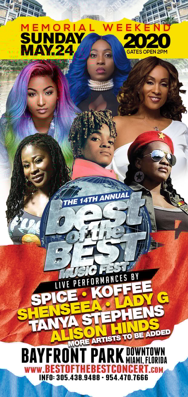 On Sunday, May 24th 2020, BOTB one of North America’s largest Caribbean music festivals will welcome Billboard charting star renowned for her showmanship, Spice (Cool It, Genie, Sheet), young reggae sensation Koffee (Toast, Raggamuffin, Rapture), dancehall phenomenon Shenseea (Blessed, Lodi, Trending Gyal), legendary Tanya Stephens (These Streets, It’s a Pity, You Nuh Ready Fi This Yet) trailblazer Lady G (Breeze Off, Nuff Respect) and popular soca Alison Hinds (Roll It Gal, Faluma, Thundah) to the stage of the Bicentennial Park in downtown Miami.