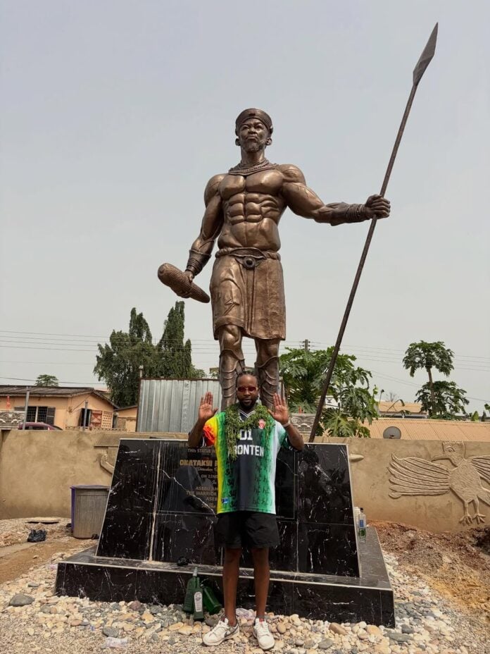 Images from the ceremony show the dancehall artiste standing before a towering warrior statue and later wrapped in vibrant traditional kente cloth while seated indoors. Other clips captured drumming and cultural performances as members of the community gathered around him.