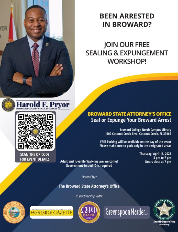 The Broward State Attorney’s Office is offering a free, one-stop workshop for individuals looking to seal or expunge their arrest records. The event takes place on Thursday, April 16, from 3 to 7 p.m. at the North Regional/Broward College Library, Coconut Creek Campus (1100 Coconut Creek Blvd, Coconut Creek, FL 33066).
