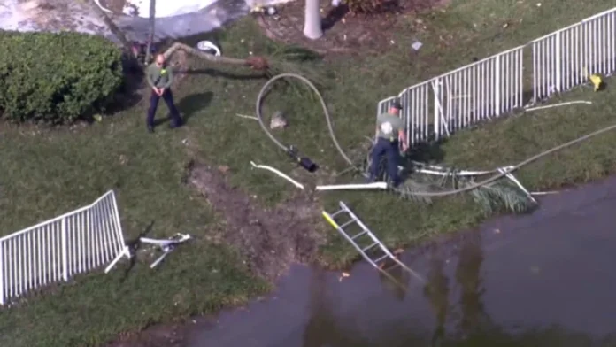 The crash occurred around 10:15 a.m. in the area of the 5000 block of Northwest 57th Way, just west of State Road 7 and south of the Sawgrass Expressway. Aerial footage showed the aircraft damaged a fence and trees in the backyard of a residence before plummeting into a man-made pond.